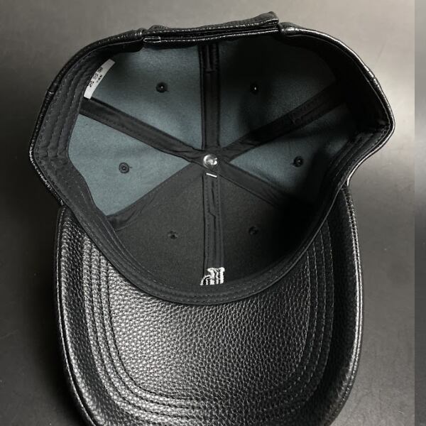 艶感のあるブラックフェイクレザーに、ブランドロゴ刺繍が映えるスタイリッシュなキャップ。