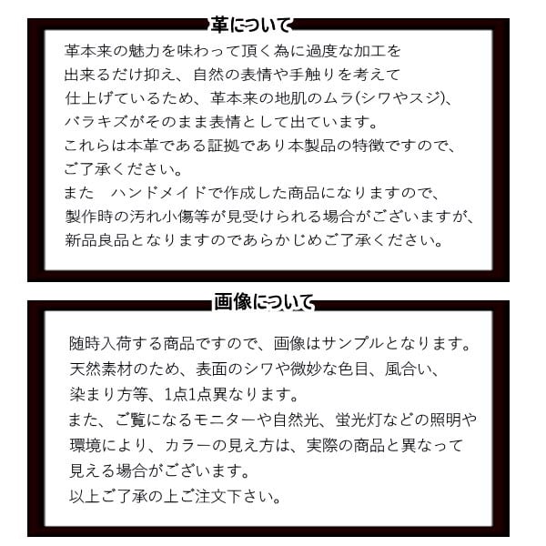 革本来の魅力を味わって頂く為に過度な加工を出来るだけ抑え、自然の表情や手触りを考えて仕上げているため、革本来の地肌のムラ(シワやスジ)、バラキズがそのまま表情として出ています。これらは本革である証拠であり本製品の特徴です。