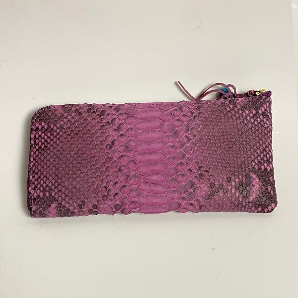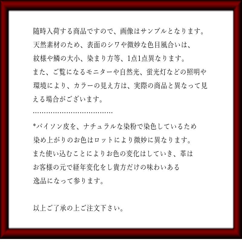 *パイソン皮を、ナチュラルな染粉で染色しているため染め上がりのお色はロットにより微妙に異なります。