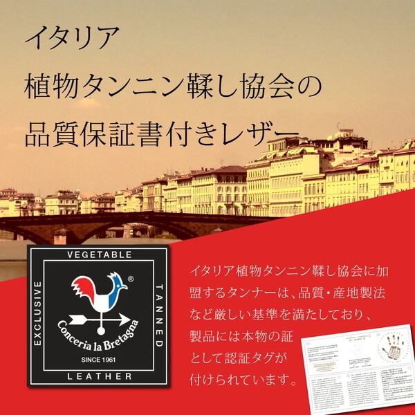 環境や人体にやさしい、バケッタ製法という植物から抽出した天然の渋(タンニン)で鞣した革に、ゆっくりと時間をかけてオイルを染み込ませるイタリアの伝統的な天然皮革の製法で作られています。